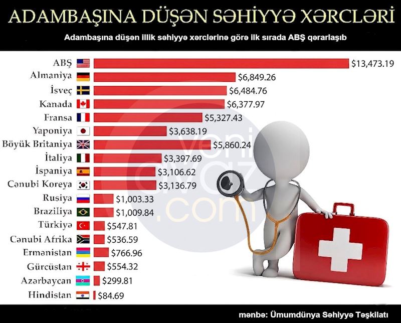 Yeniavaz.com xəbər verir ki, bu məlumat Ümumdünya Səhiyyə Təşkilatının açıqladığı son statistik göstəricilərdə yer alıb. ABŞ-də adambaşına düşən illik səhiyyə xərcləri 13 min 473 dollara çatıb. Avropada isə Almaniya (6 849 dollar) və İsveç (6 485 dollar) ən yüksək göstəricilərə malik ölkələr sırasındadır. Kanada və Fransa da adambaşına 5000 dollardan çox vəsait ayırmaqla yüksək xərcləmə trendini qoruyur.