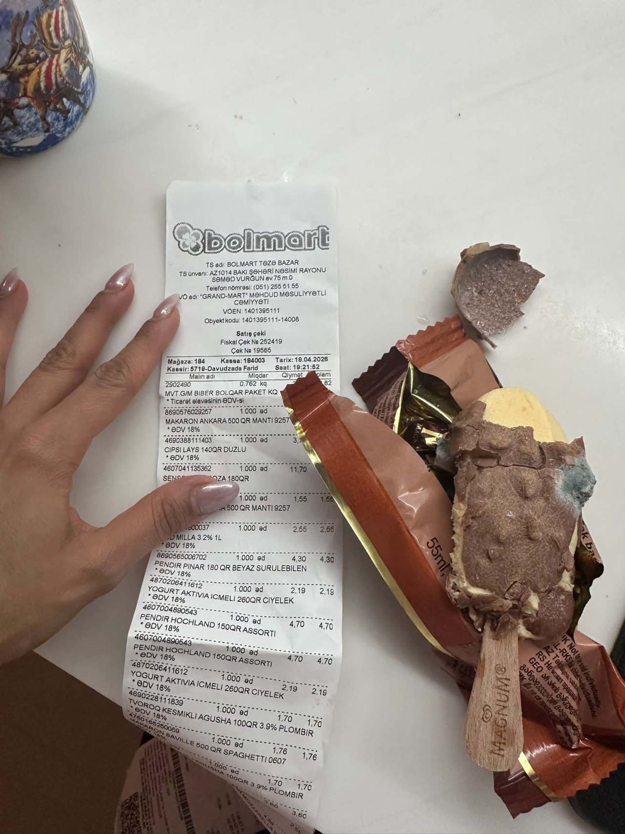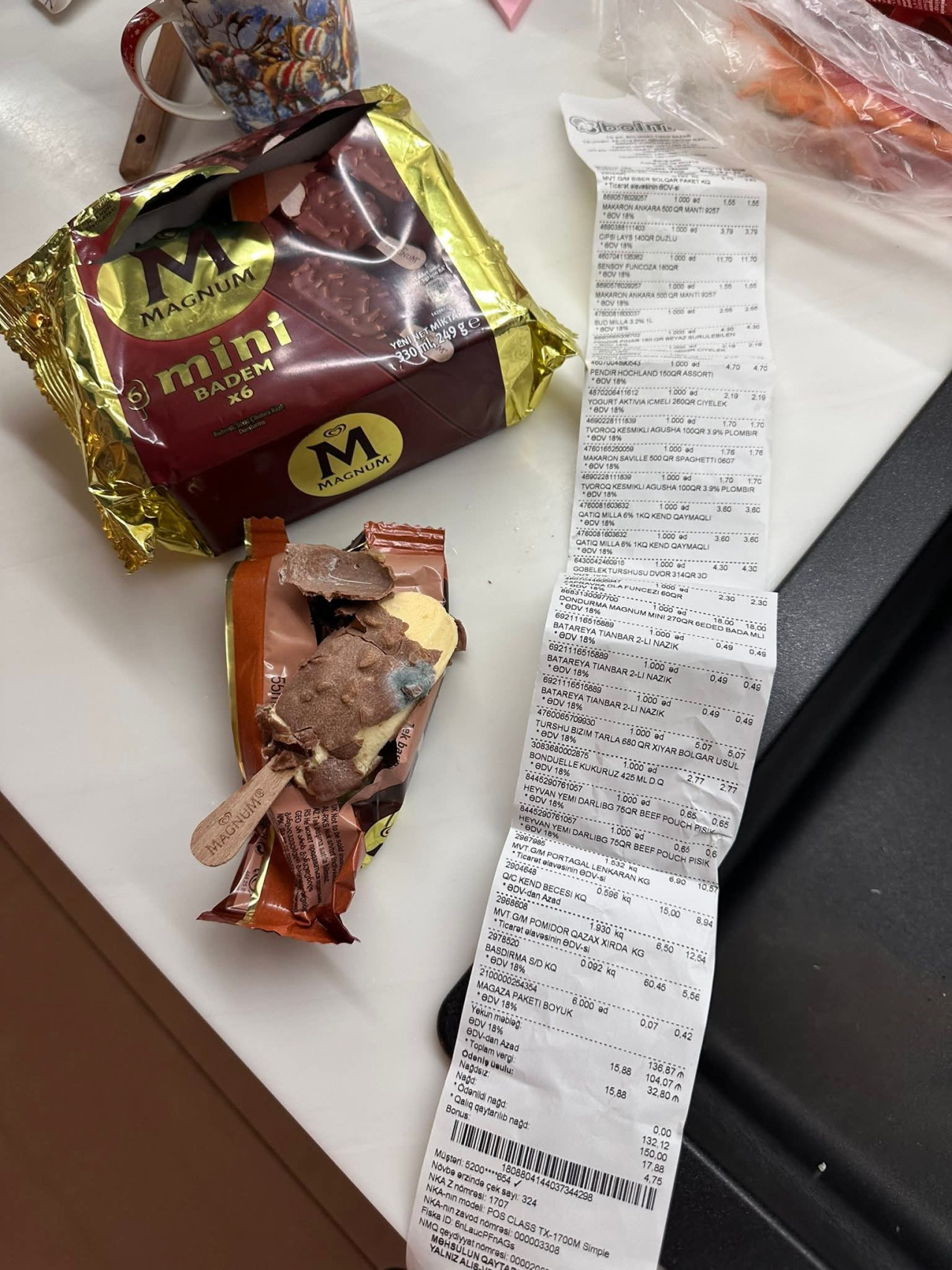 32gun.az yazır ki, Çinarə adlı müştəri qeyd edib ki, mağazadan aldığı "Magnum Mini Badem" markalı dondurmanın qablaşdırmasını açdıqda məhsulun kifləndiyinin şahidi olub.